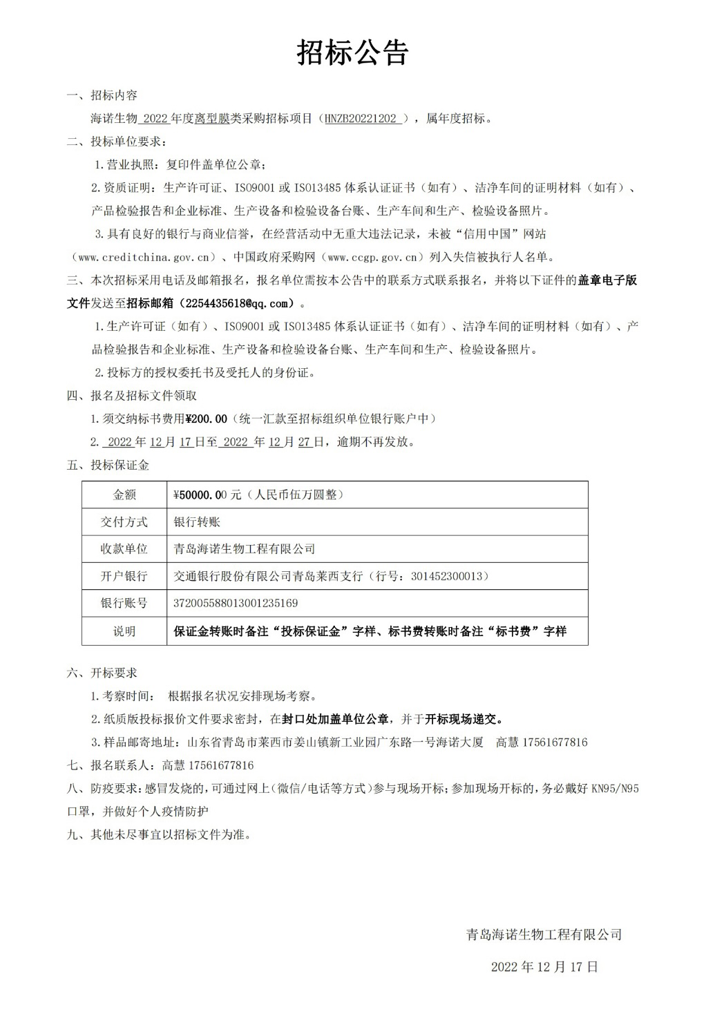 2022.12.18海諾生物2022年度離型膜類采購(gòu)招標(biāo)項(xiàng)目現(xiàn)已正式開始,屆時(shí)我們將秉承公正、公平、公開、透明的招標(biāo)原則,期待優(yōu)秀供應(yīng)商的廣泛參與。具體招標(biāo)細(xì)節(jié)如下:
