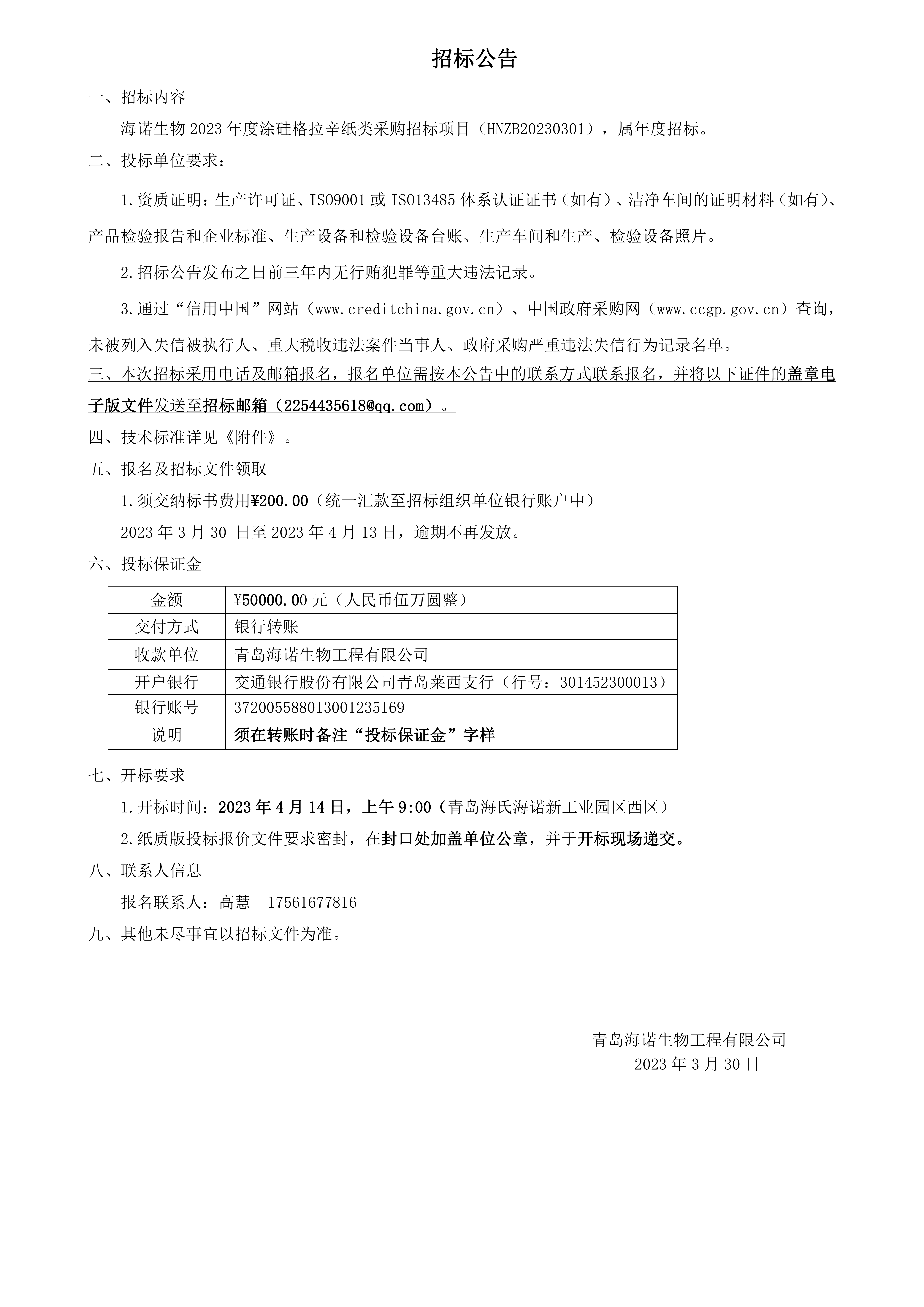 海諾生物 2023 年度涂硅格拉辛紙類采購招標項目正式開啟