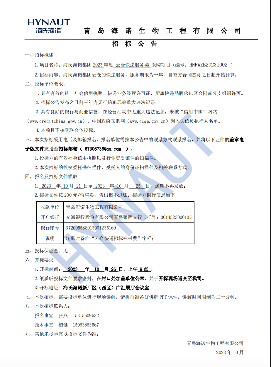 《海氏海諾集團(tuán)2023云倉(cāng)快遞服務(wù)類采購(gòu)項(xiàng)目招標(biāo)公告》